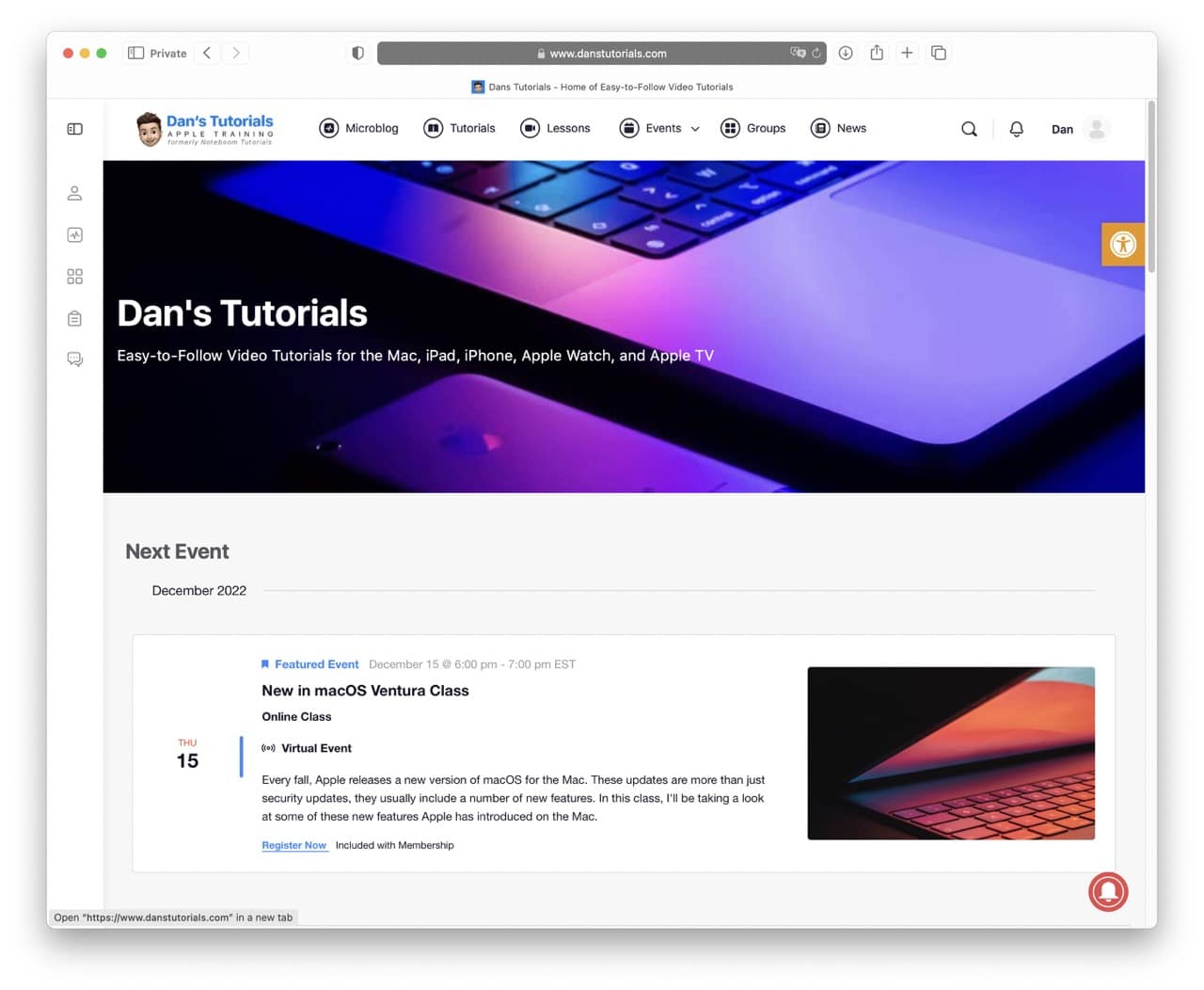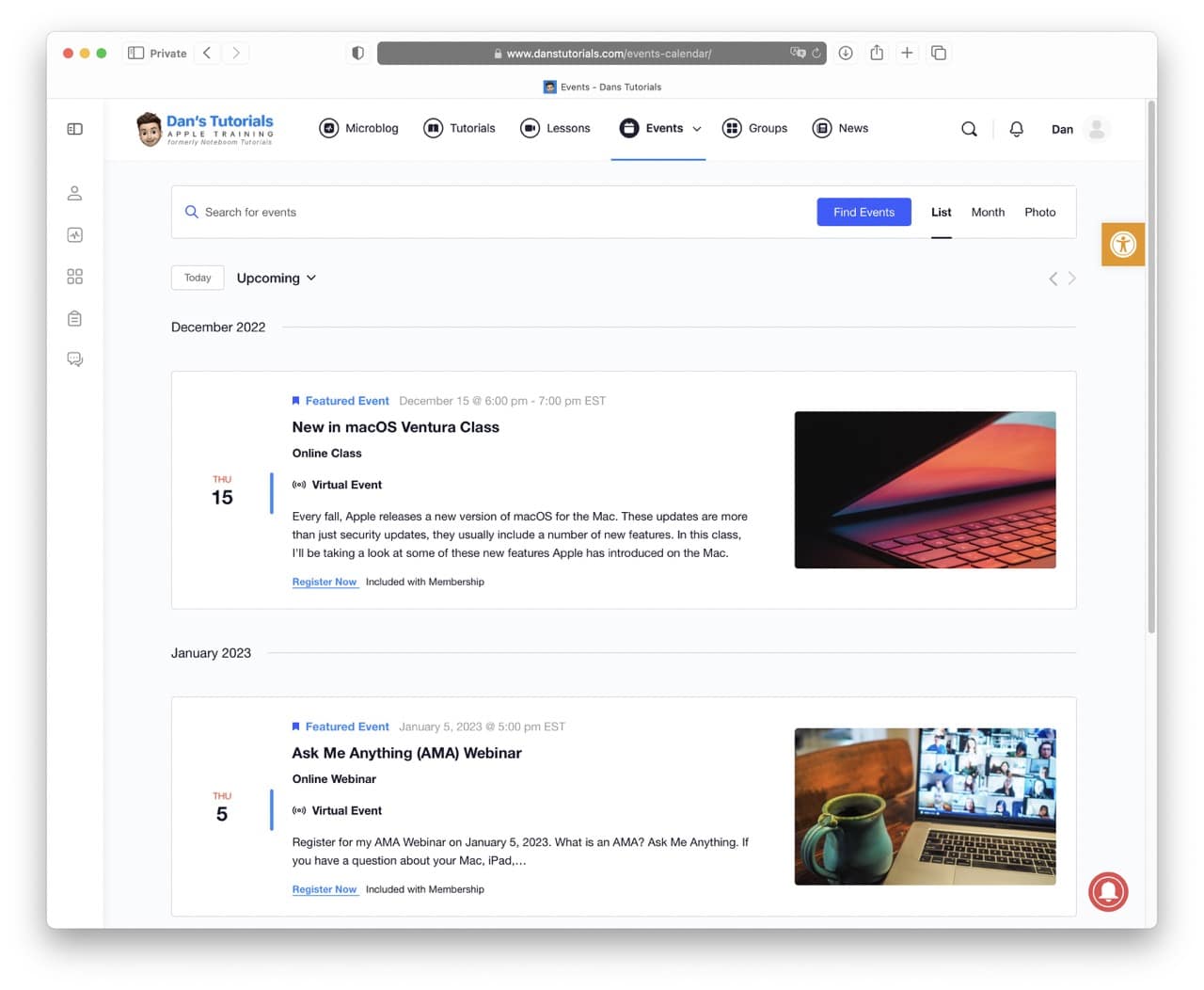 - Events: This has been redesigned and offers a new easy to find what is upcoming and even my past events. All the Zoom information, including the meeting ID and password, are located on the event page. I can make this information public or show it for members only.
