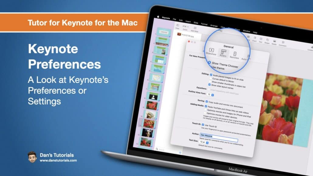 In Keynote preferences, you can set what theme to use by default, the color of your guides, if you want to use Touch ID, if you want to show the point…