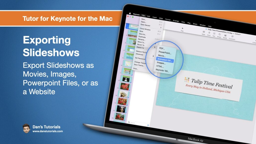 Did you know you could export your Keynote slideshow or presentation as a PowerPoint document? Or a movie? Or as Images? You can also export it html a…