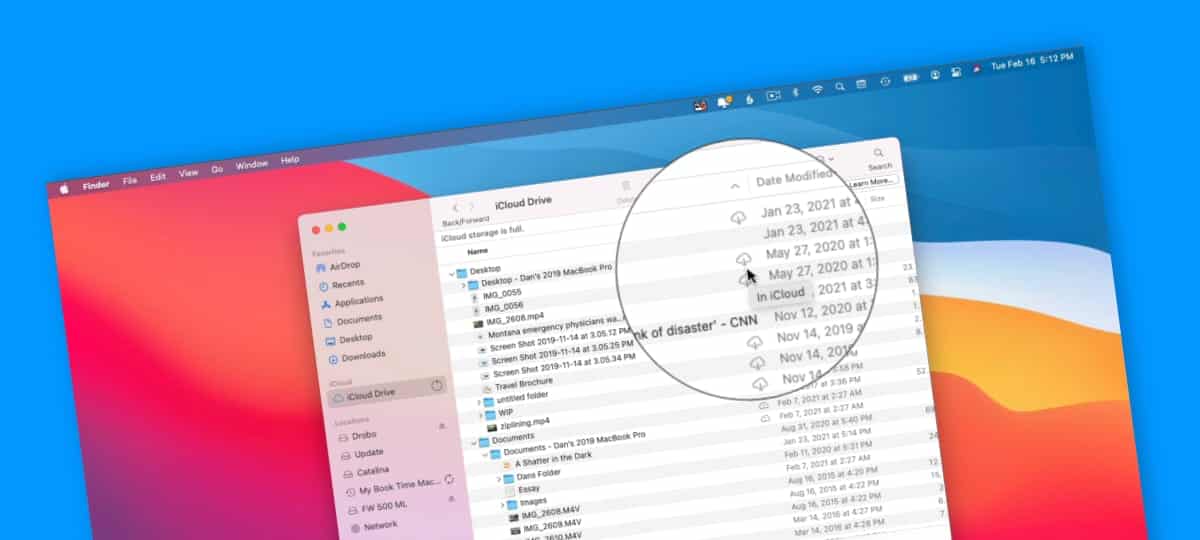 The best-case scenario is to have no icons at all. Again, this represents that the file is an iCloud, and it’s on your Mac. So if you see a file with an arrow pointing down, it’s in iCloud, not on your Mac. You’re not going to be able to open it up if you are not on the network. If you see a cloud with an arrow pointing up, it means it’s on your Mac, but not an iCloud. And then if you see an exclamation point, it means that you’re out of space or there’s an error. To see what the error is, all you have to do is just move your cursor over the top of it; you’re going to see mine says out of space, so it cannot put that file there. I’d have to purchase more space in iCloud to put that file there.