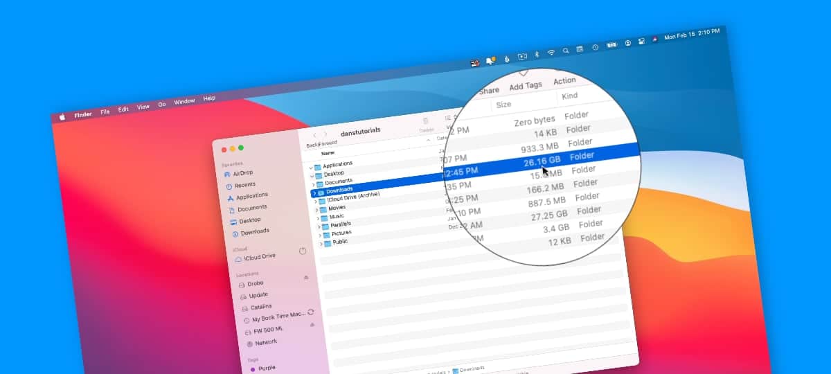 So now, let’s go ahead and turn this on. We’re going to close this window, and if we look over to the right of my folders, I can see how much space each folder is taking. So now I can see that downloads here are taken up 26 gigabytes. I can see that Parallels here is taking up 27 gigabytes.