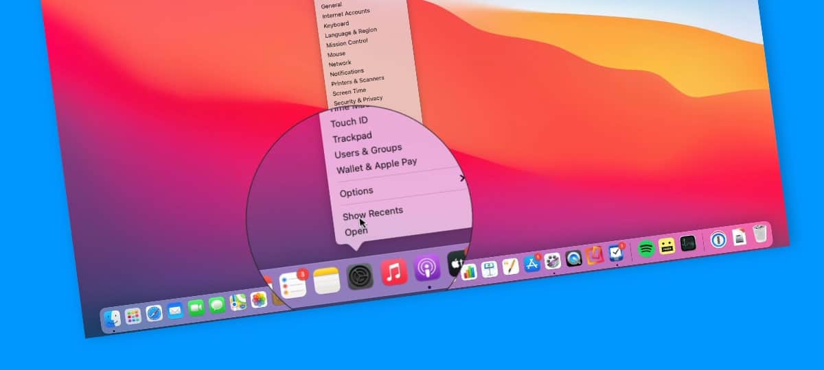 So that’s how we can easily select Preference Panes in System Preferences. If we’re within the System Preferences, we just click on the dots, click and hold on the dots at the top, in the toolbar. When we click and hold on that, we’re going to have all of our different Preference Panes available to us. We just select the one we want to open. We can also do the same thing when the System Preferences is in our Dock. We just click and hold on the System Preferences icon in the Dock, and when we do that, we’re going to have a pop-up menu, and we’re going to be able to select from all of our different Preference Panes.