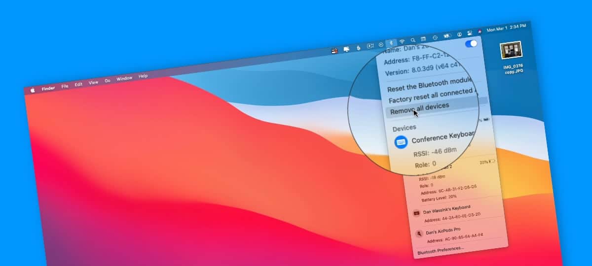 Now, if you have problems with multiple devices, well, you’ll have to do this individually for each one. Well, if they’re Apple devices, there is a shortcut to reset all of your Apple devices. What we need to do is go back up to our menu bar. We go to our Bluetooth, and then instead of just clicking on it, remember when I click on it, I get my different devices here. Some people may know that I do have different options when I hold down the command key, but there’s another option. If I hold down the option and shift key simultaneously, I have the option and shift key, and when I click, I have a new option. I can factory reset all of my Apple devices. I can also remove all of my devices, and then I have to add them all back in. And then, if I want to reset the whole module, I click on reset the Bluetooth module, and it would reset it. What I’ll have to do is pair up all my devices again.