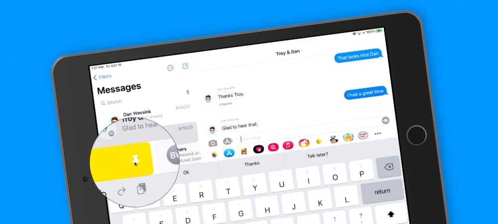 And then you’re going to see on pin. I tap on this. It doesn’t delete the conversation, but what it does do is it on pins it and moves it back into the conversation list. So that’s how we pin our conversations in the Messages app on the iPad. Again, this was introduced with iPadOS 14 to pin a conversation.