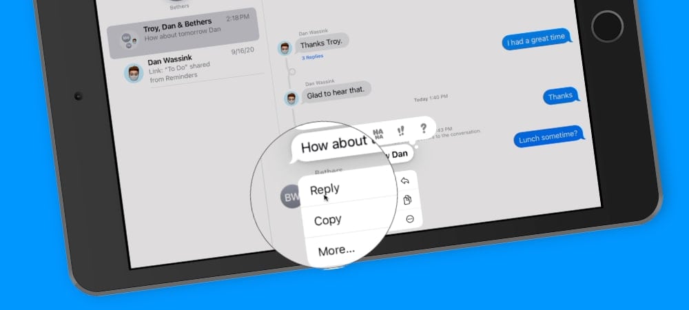 So that’s how we use inline replies in the Messages app on the iPad. When we use an inline reply, we’re able to isolate the messages between two people within a group conversation. To reply with an inline reply. You tap and hold on the message itself. You’ll see a pop-up menu and then tap on reply. When you do that, you’ll be creating an inline reply. Your recipient will be able to isolate that message or the messages between you and them within a group conversation. So that’s how you create inline replies in the Messages app on the iPad.