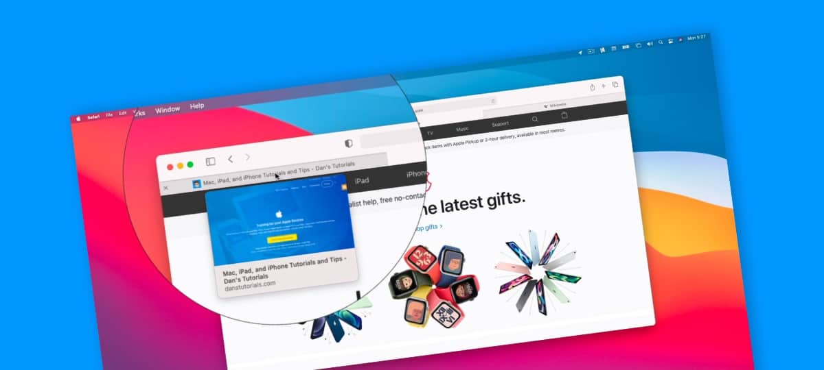 So now I have three tabs open in this browser. One window with three tabs. I can easily go to different websites by just clicking on the tab. But you may have noticed that when I hover my cursor over top of a tab, what I get is a preview of that website. This is our new tab preview that was introduced with macOS Big Sur. But again, you will also see this if you update macOS Catalina. So now I can easily get a preview of a website just by hovering over the tab. Let’s go and see what the Wikipedia tab looks like. Again, I just placed my cursor over the tab, and then I get a preview. I don’t actually have to click on it to see what is in that browser or what is in that tab. If I want to switch to it, all I have to do is just click on it, and now I’m looking at that website. Let’s go and see what Apple has on their front page. I go over to Apple here; we get our preview. And again, I go over to my tab here with Dan’s Tutorials; I have a preview.