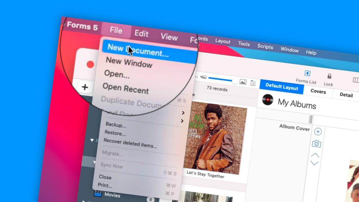 To create a new database document to store your forms, all you have to do is go up under File, and then you’re going to see New Document. Now, before I do that, what I’m going to do is I’m going to close this database document here, so then it’s just not showing when I create a new document. So now I just go back up under File, and then we go over to New Document.
